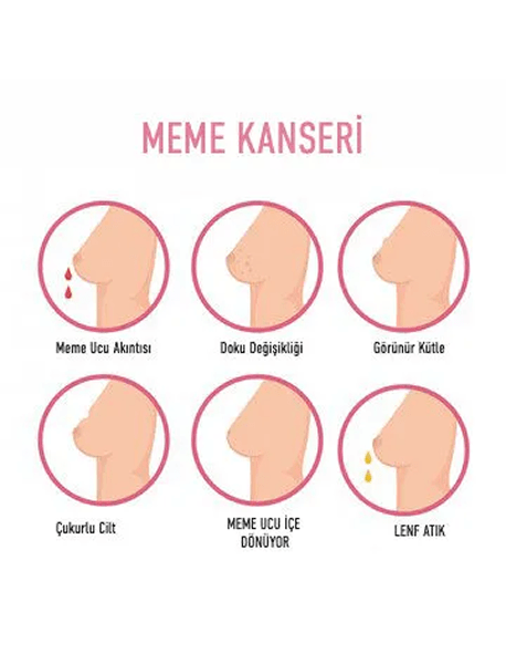 Memede veya koltuk altında şişlik, kalınlaşma, meme cildinde tahriş veya çukurlaşmayla birlikte kızarıklık, pullanma, ağrı, meme ucunda kanamalı akıntı ve meme ucunun içeri çekilmesi meme kanseri belirtileri arasındadır.